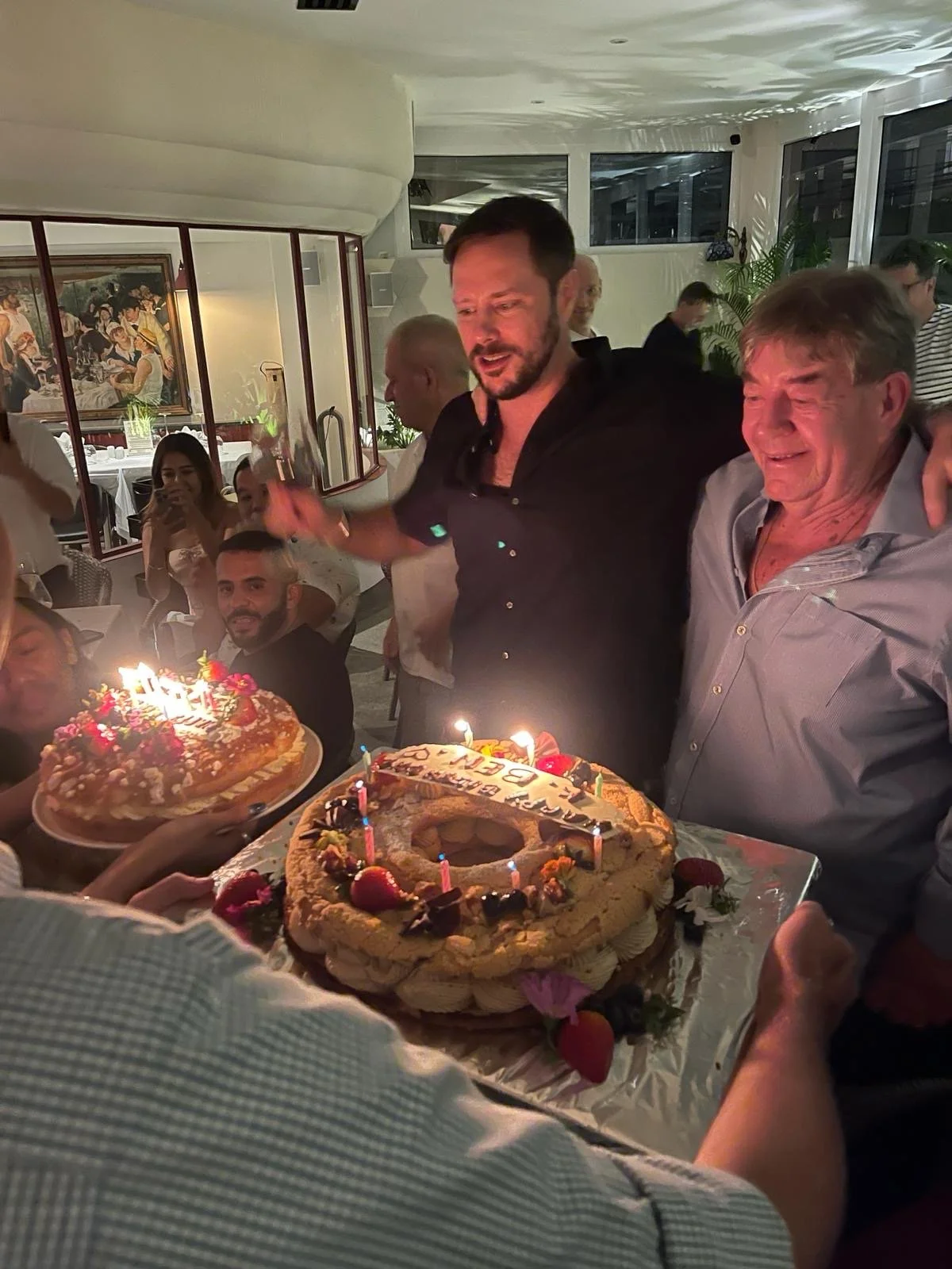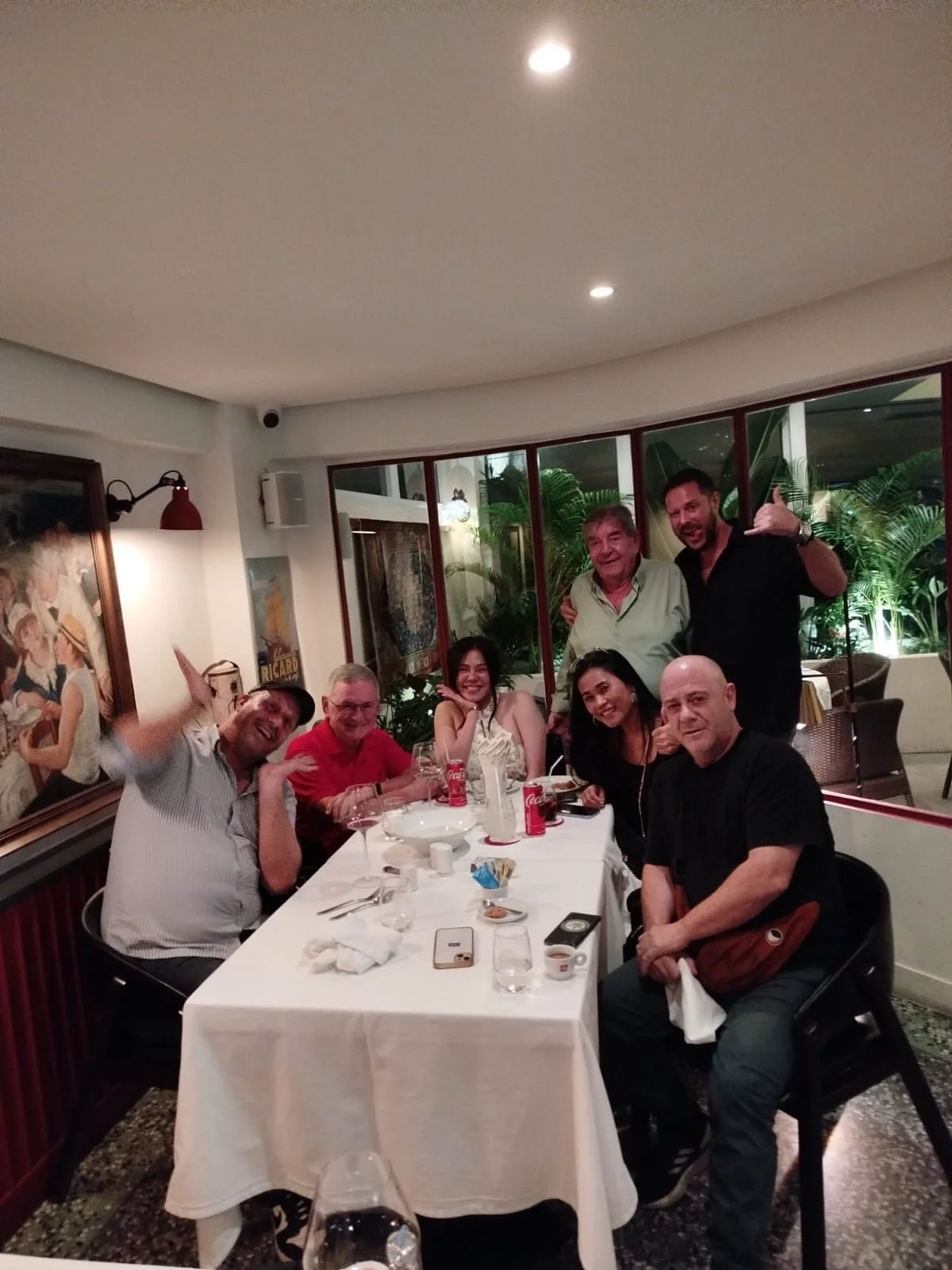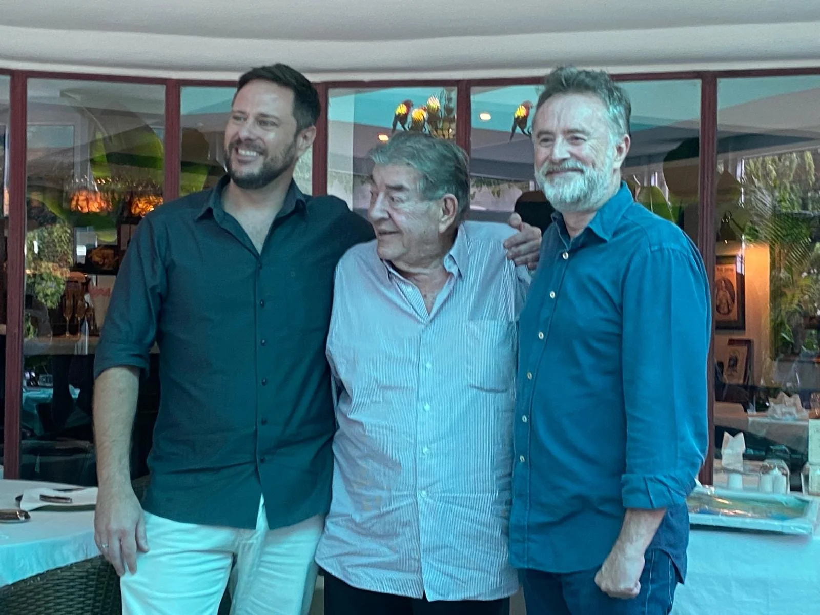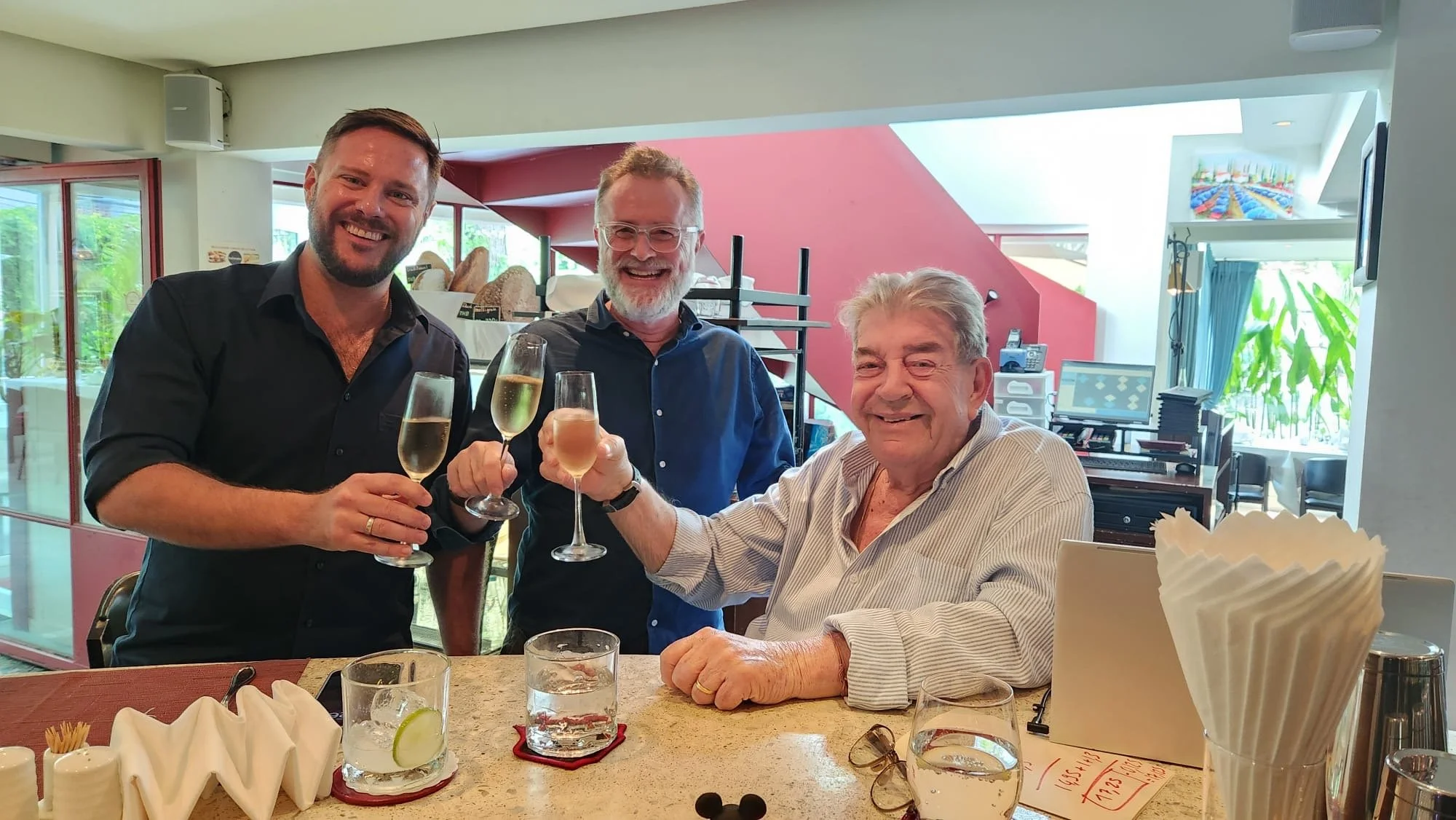 Three men standing together and smiling indoors in a restaurant, with their arms around each other.