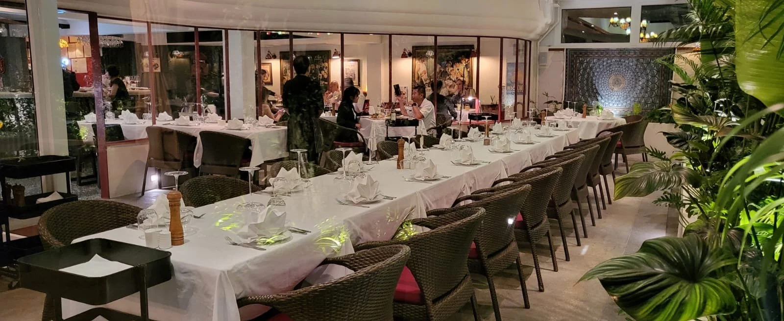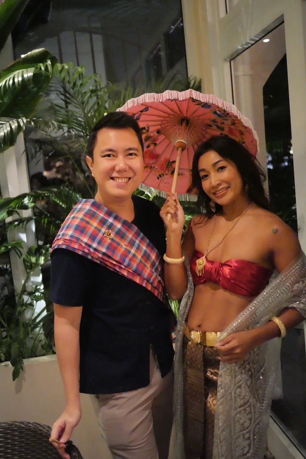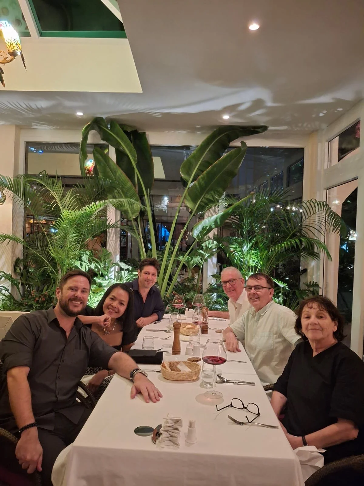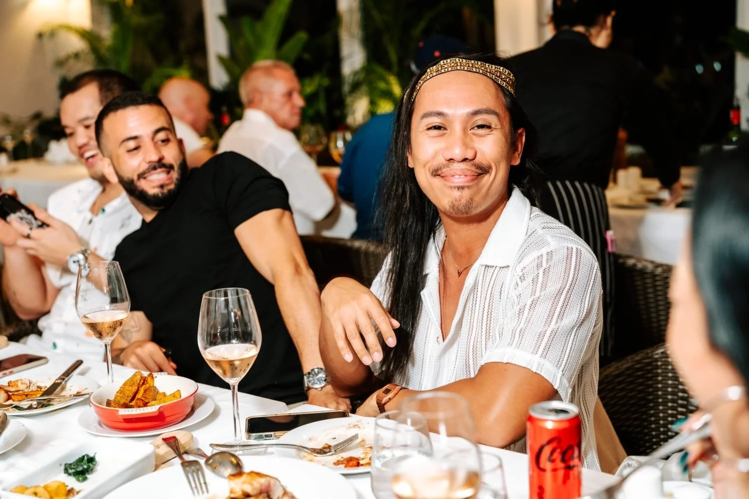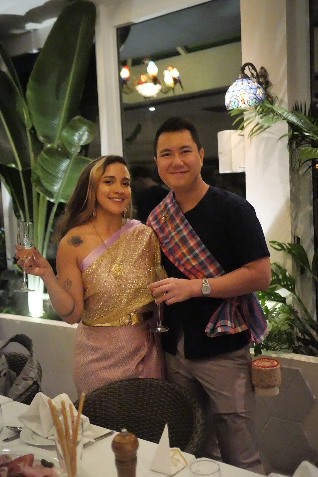 A woman and man smiling in a restaurant, holding glasses of champagne, with tropical plants and decorative lanterns in the background.