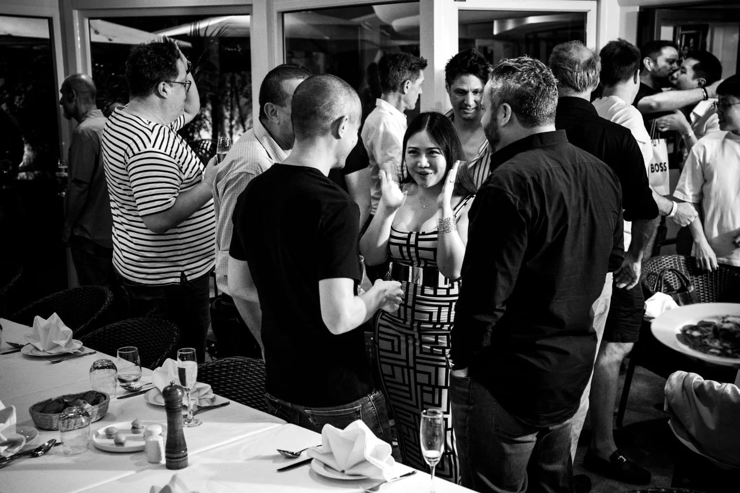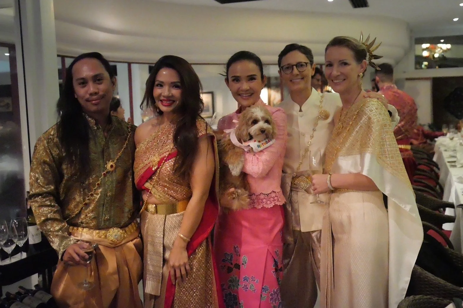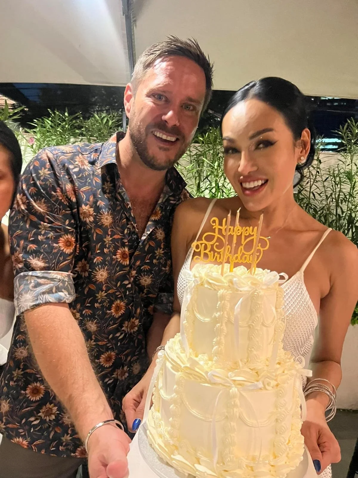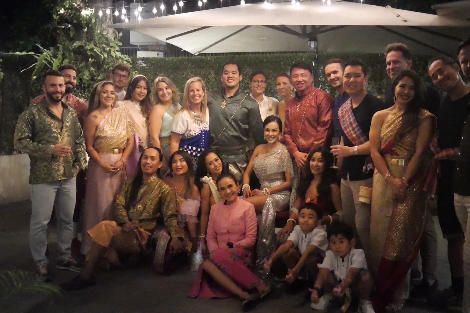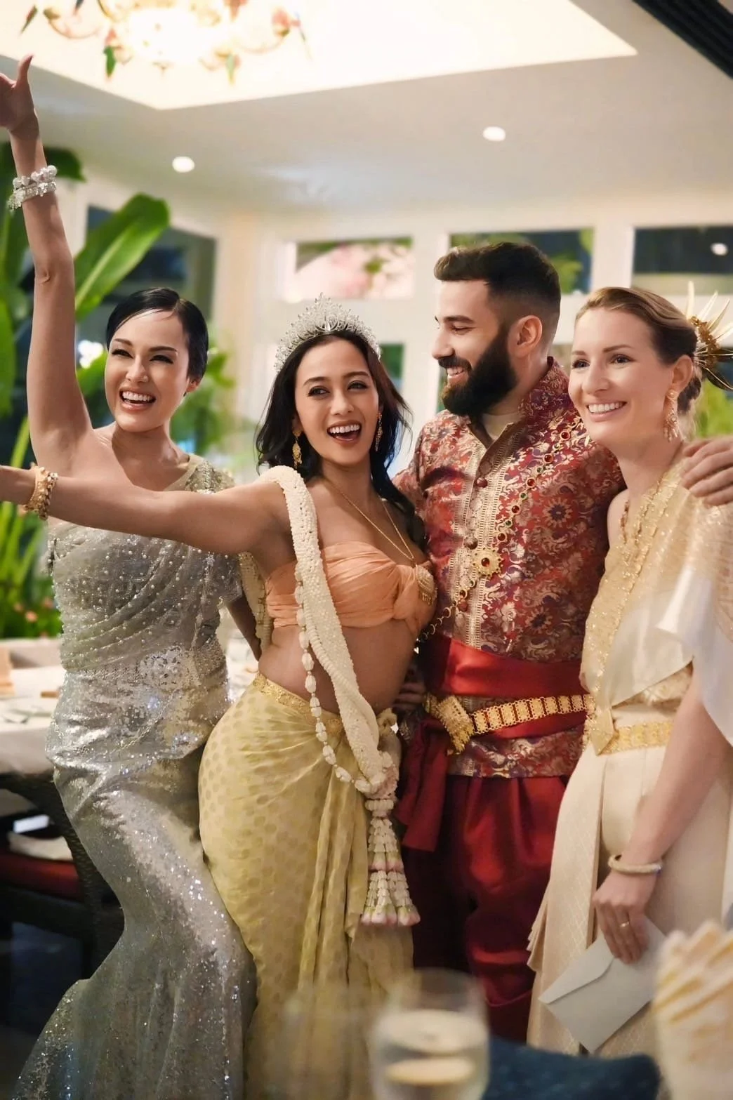 A woman and man smiling in a restaurant, holding glasses of champagne, with tropical plants and decorative lanterns in the background.