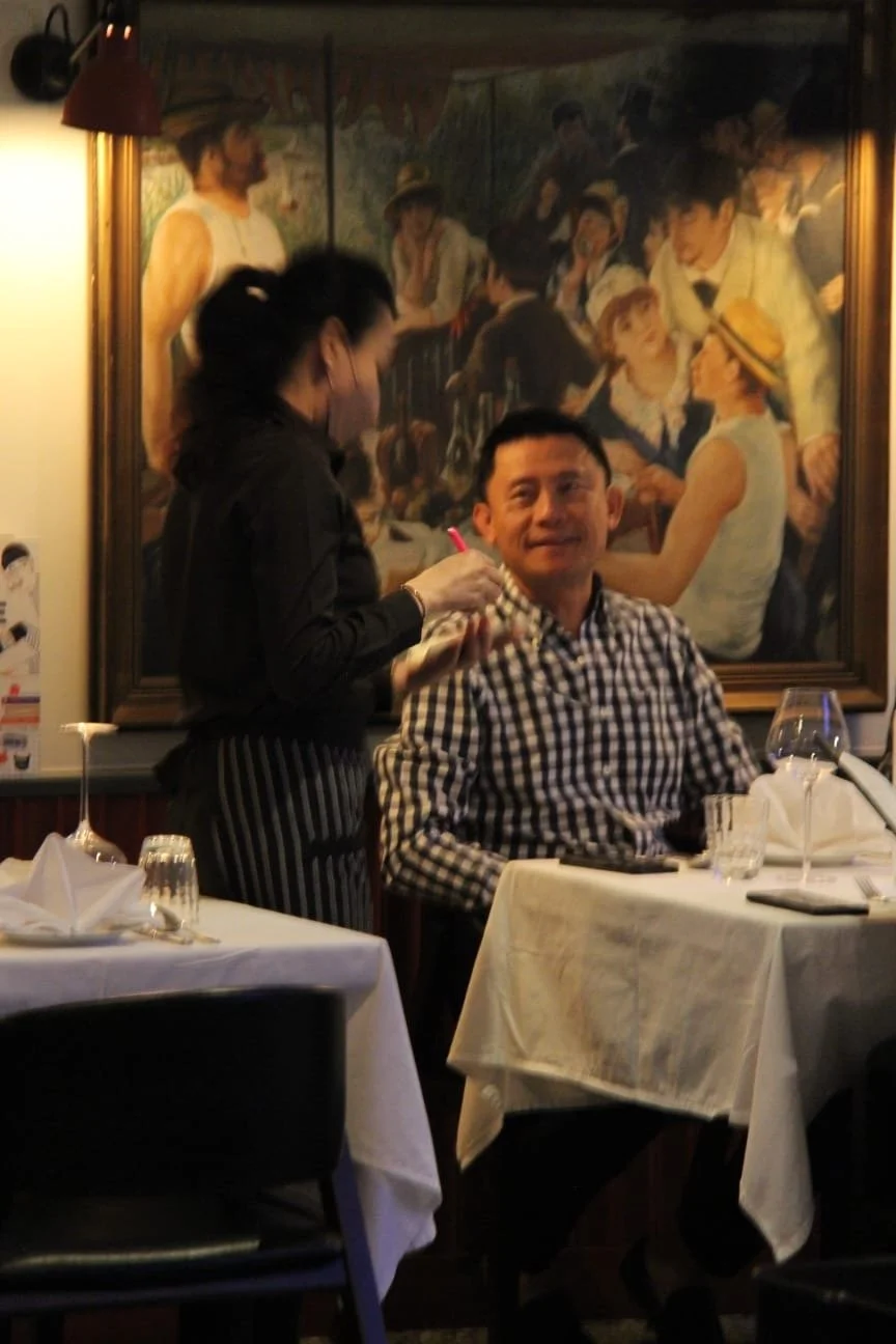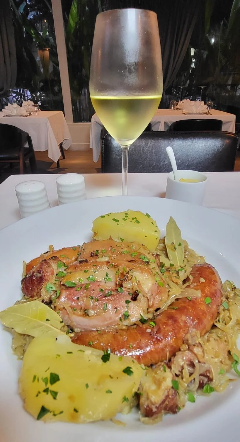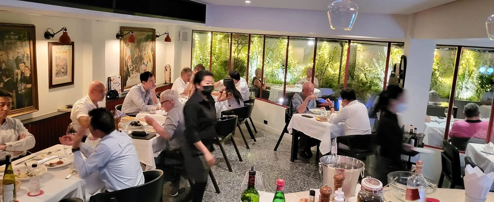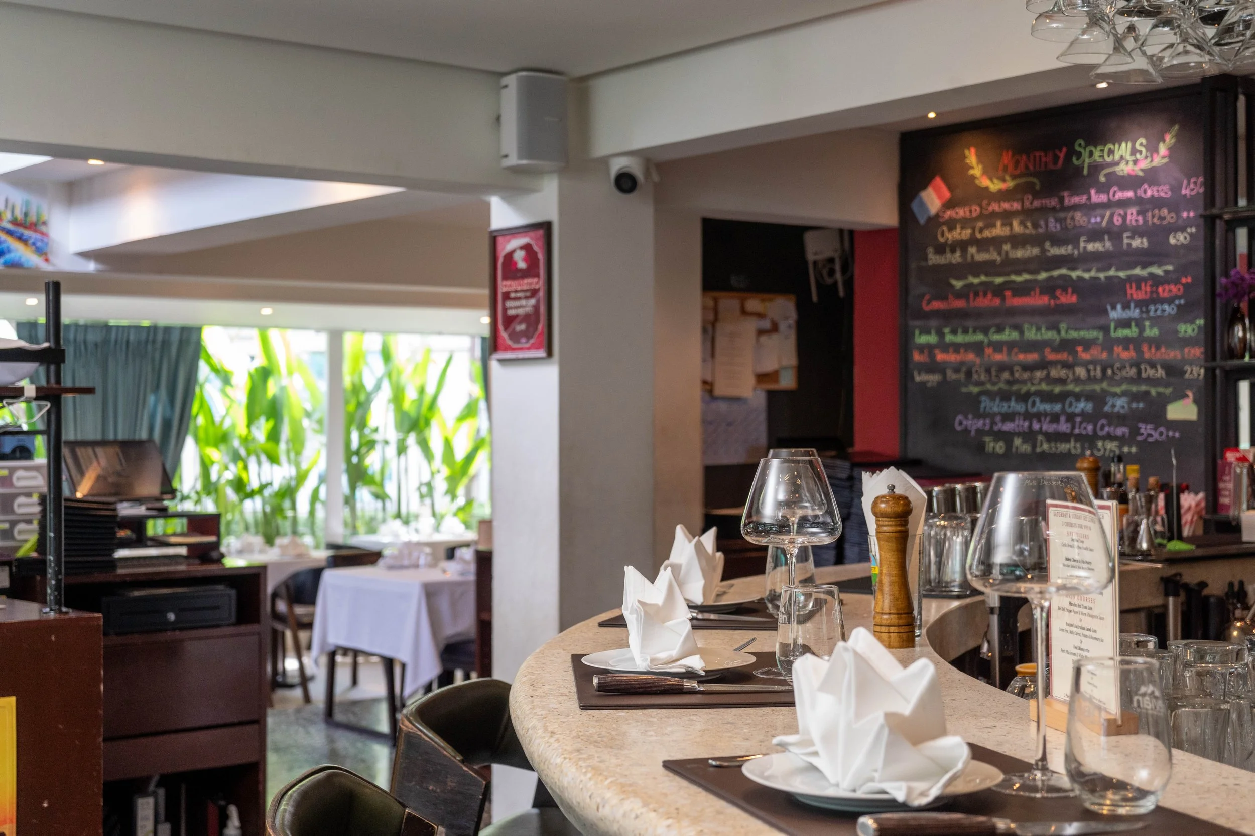 A cozy restaurant interior with a bar counter set with white napkins, wine glasses, and cutlery, and a chalkboard menu in the background.