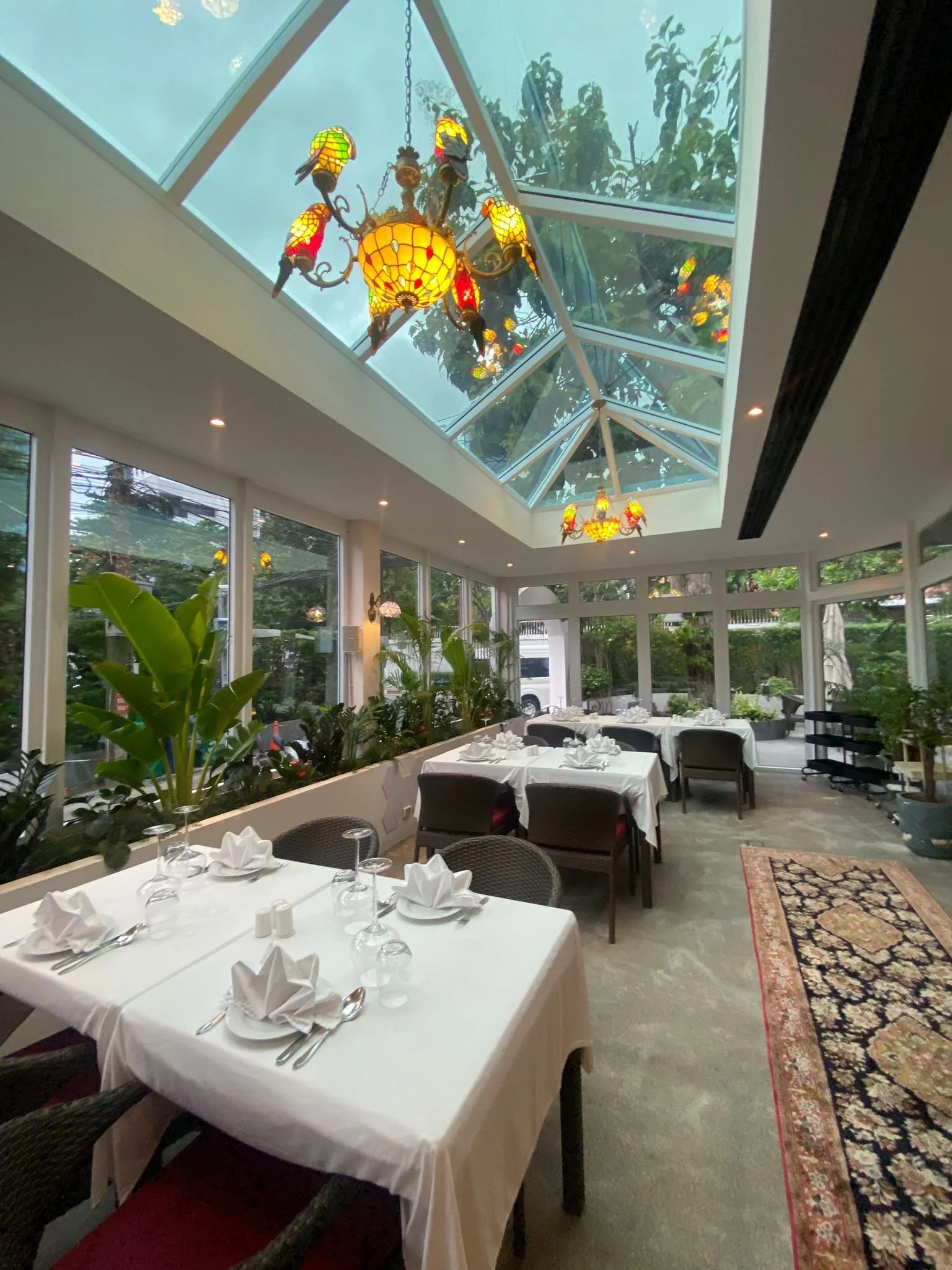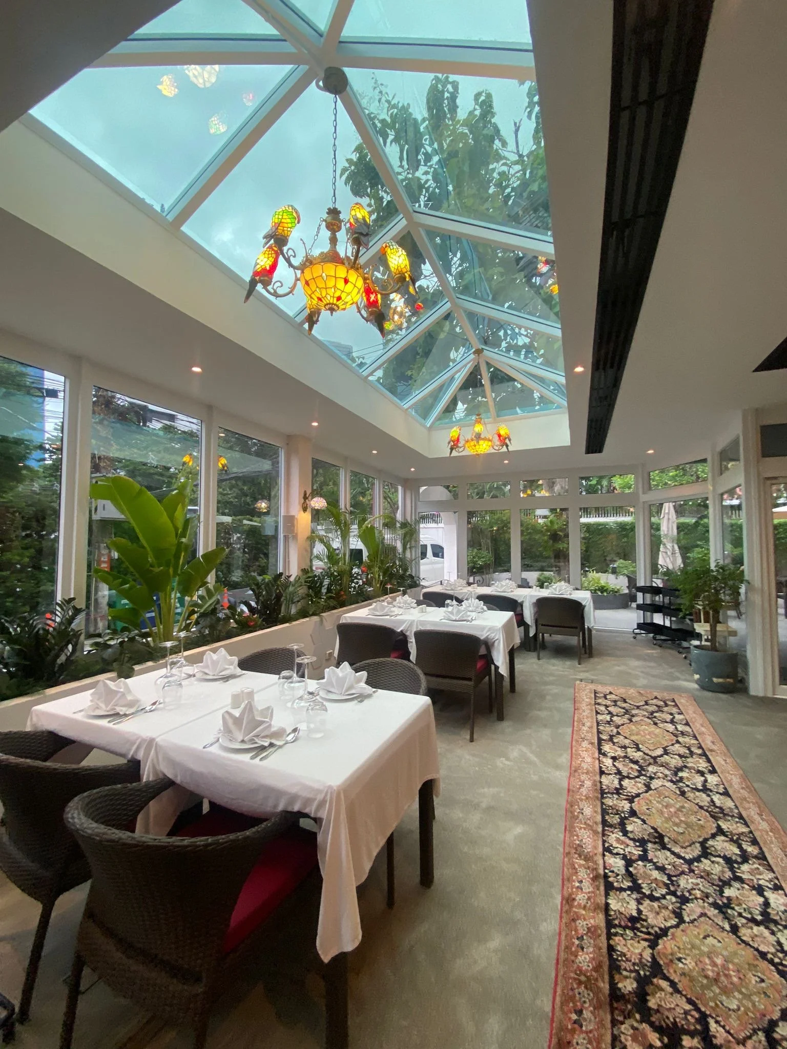A sunlit restaurant dining area with round tables covered in white tablecloths, neatly set with napkins, glasses, and silverware. Large windows surround the room, providing a view of greenery outside. A patterned rug runs along the carpeted floor, an