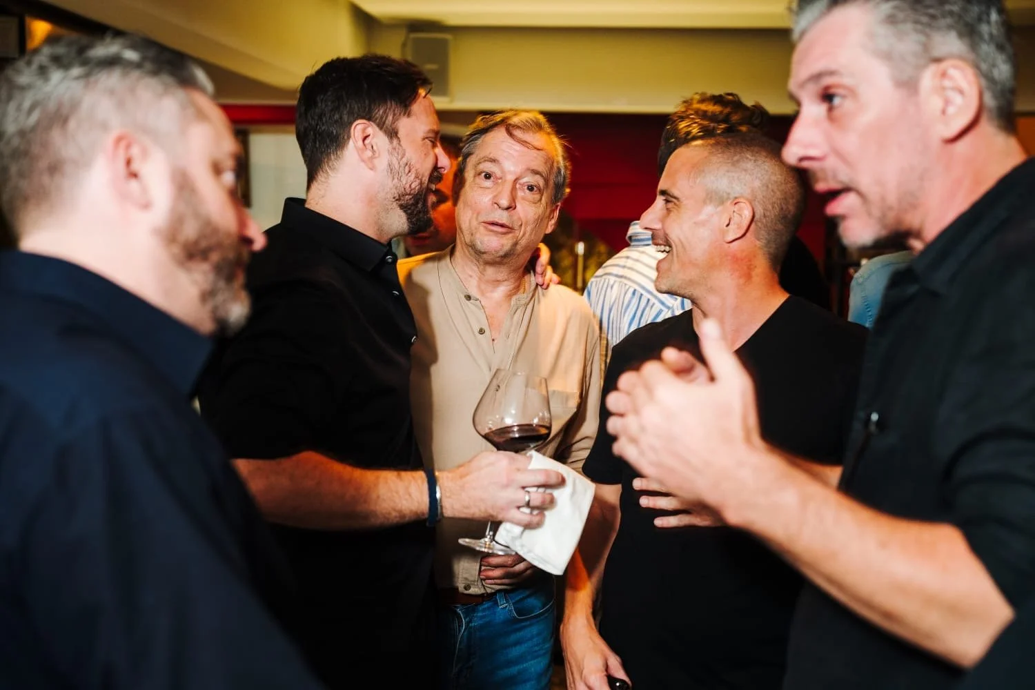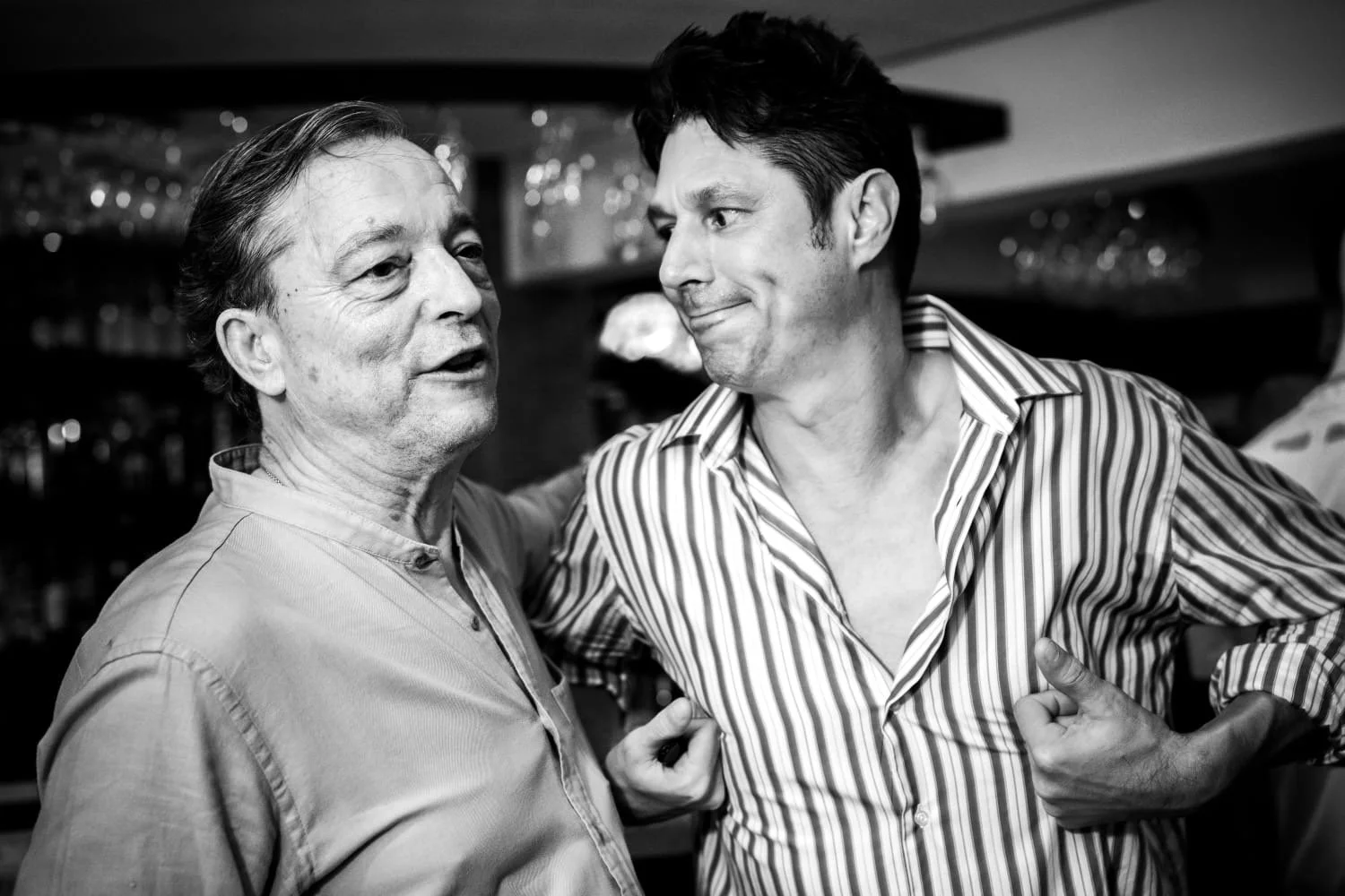 Two men having an intense conversation in a social setting, with one man pointedly making a fist and the other looking at him with a raised eyebrow.
