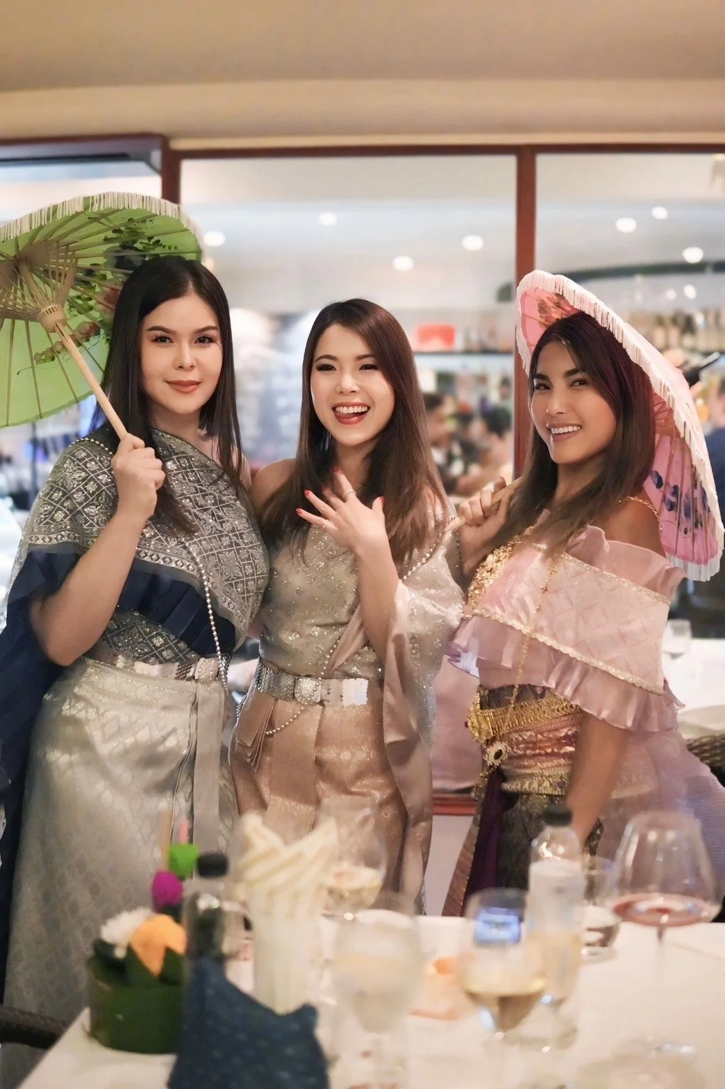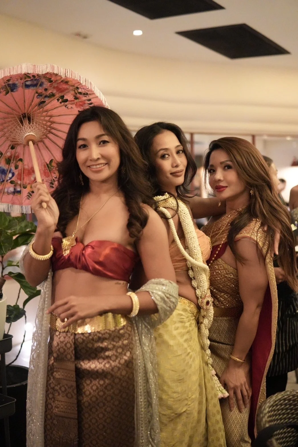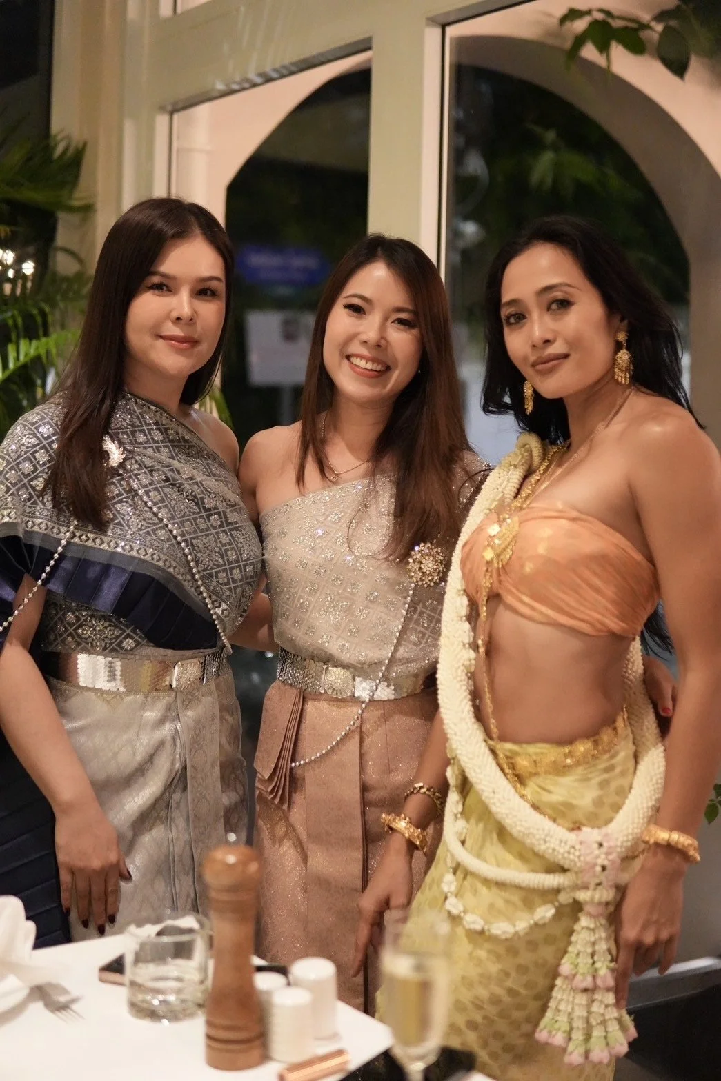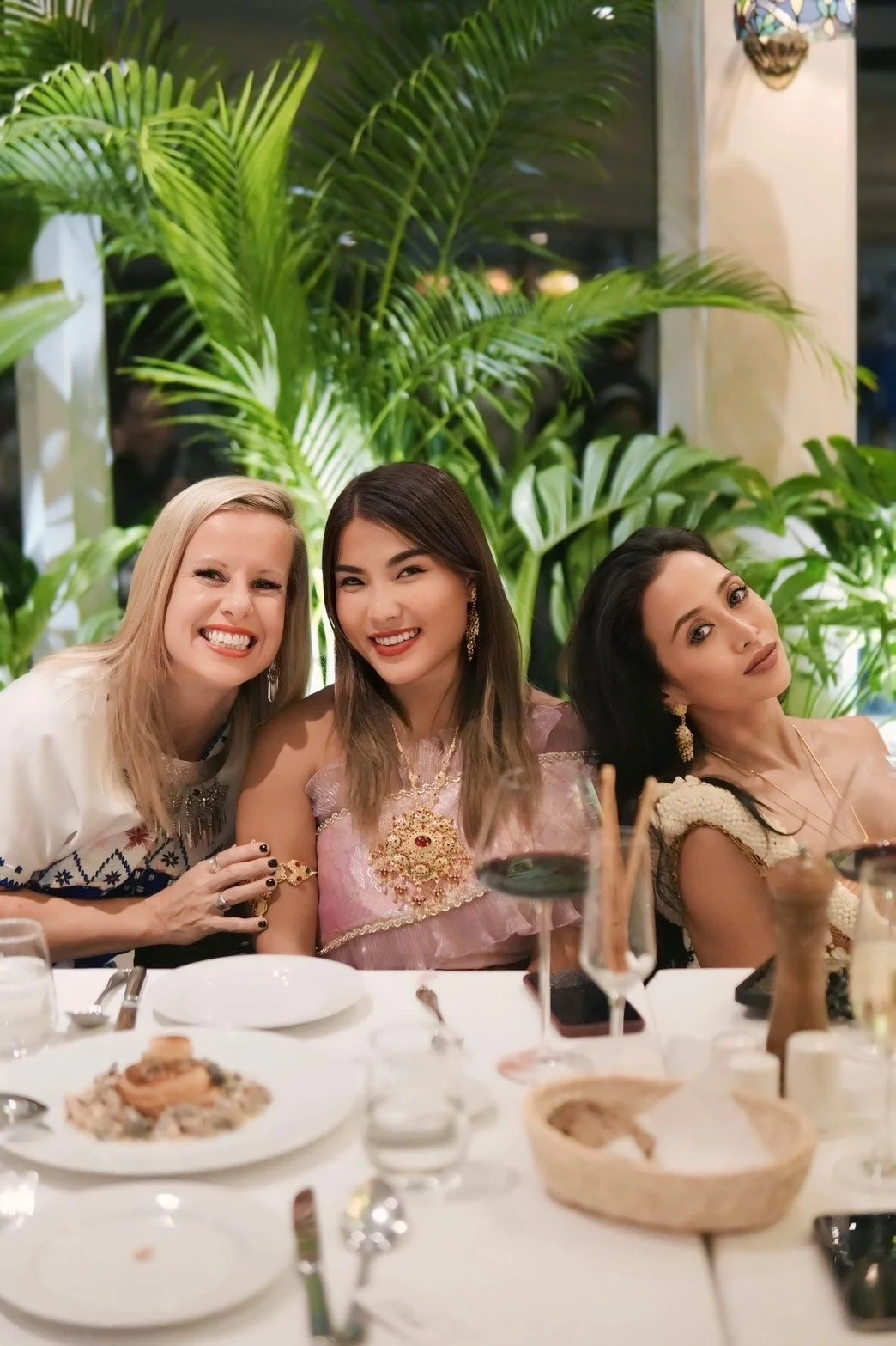 Three women sitting at a table during a dinner event, smiling and looking at the camera, with green plants and a decorative lamp in the background.