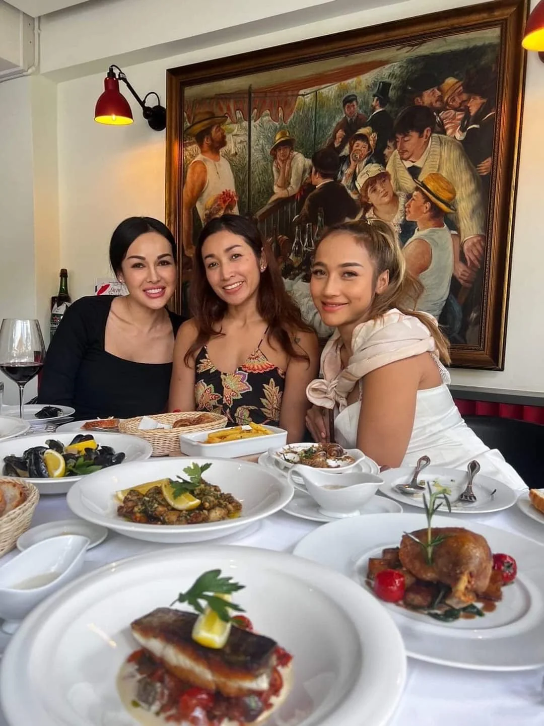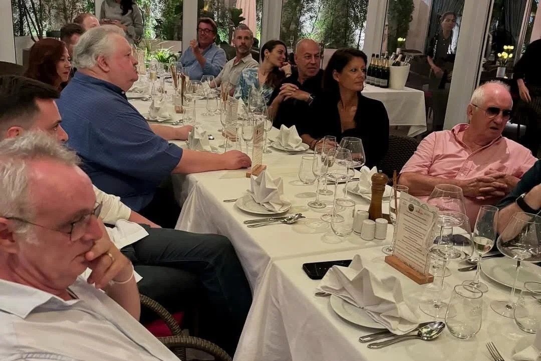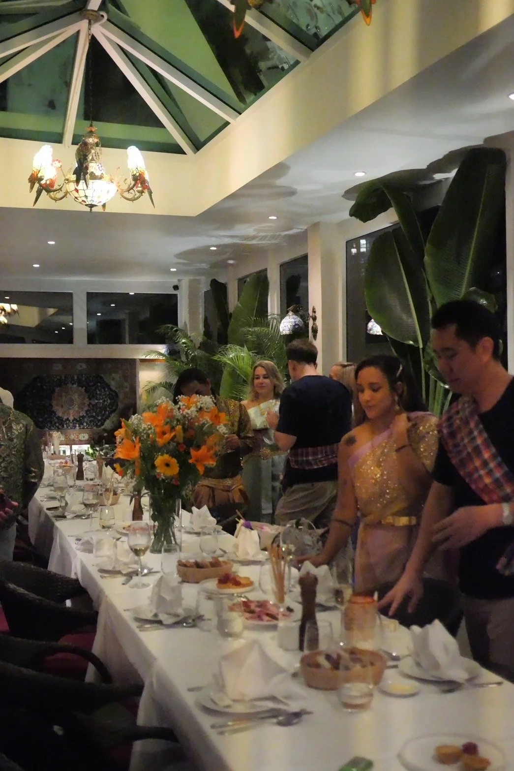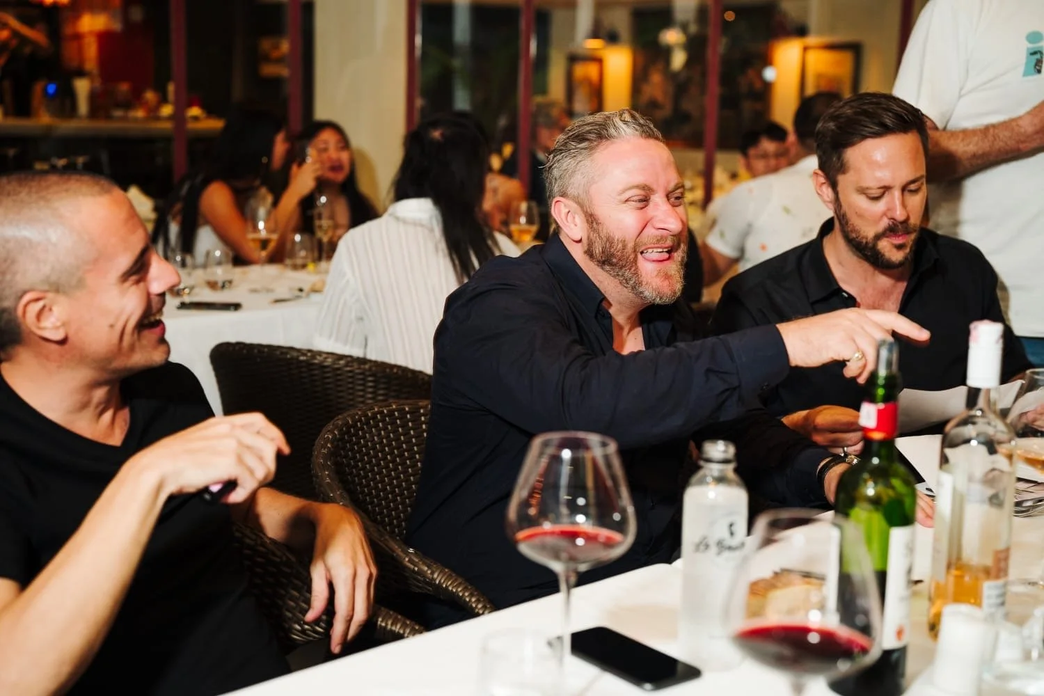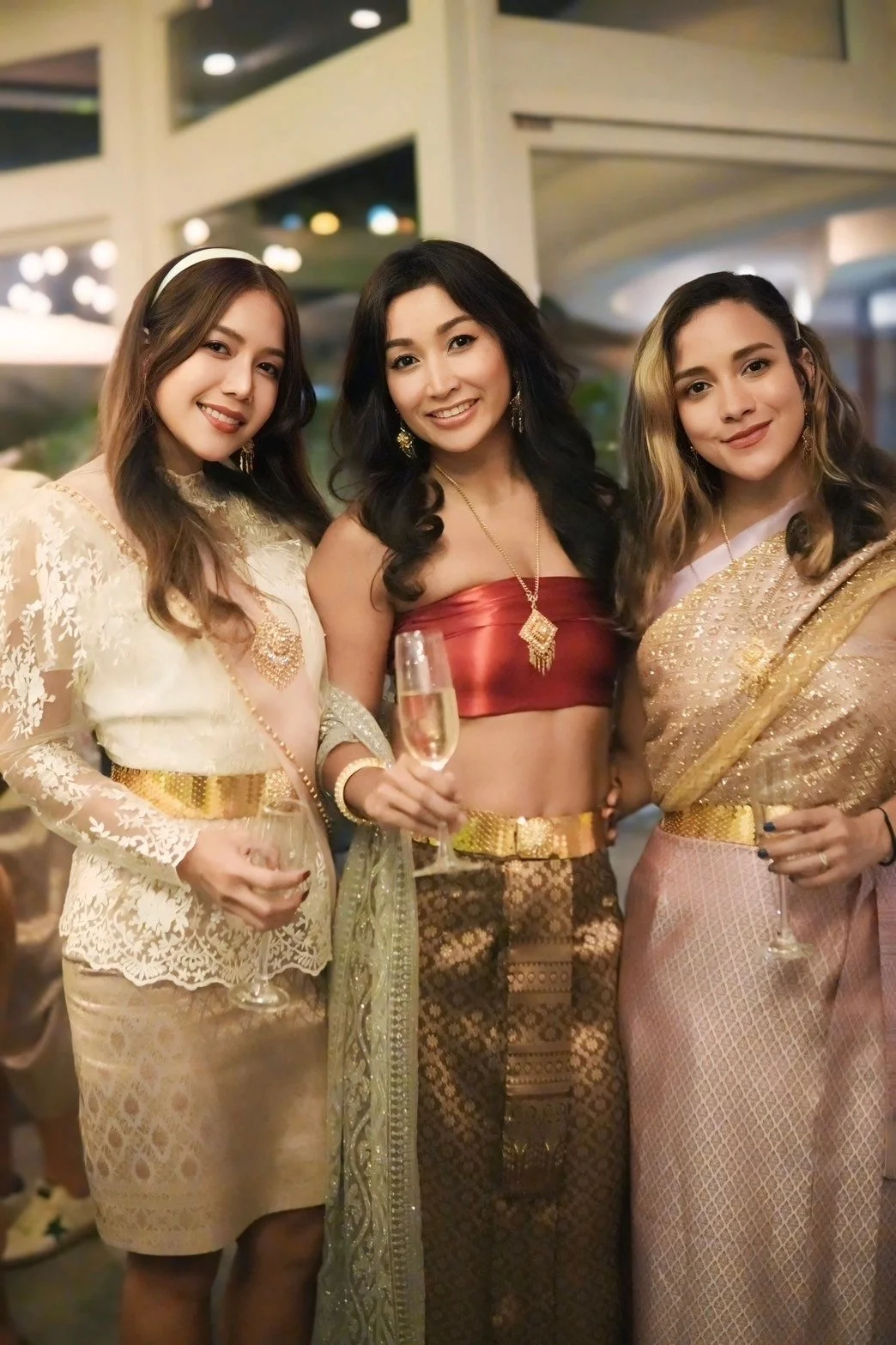 Three women sitting at a table during a dinner event, smiling and looking at the camera, with green plants and a decorative lamp in the background.
