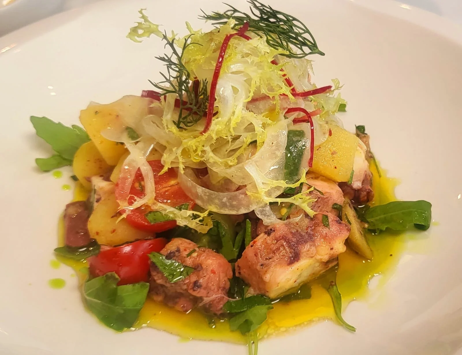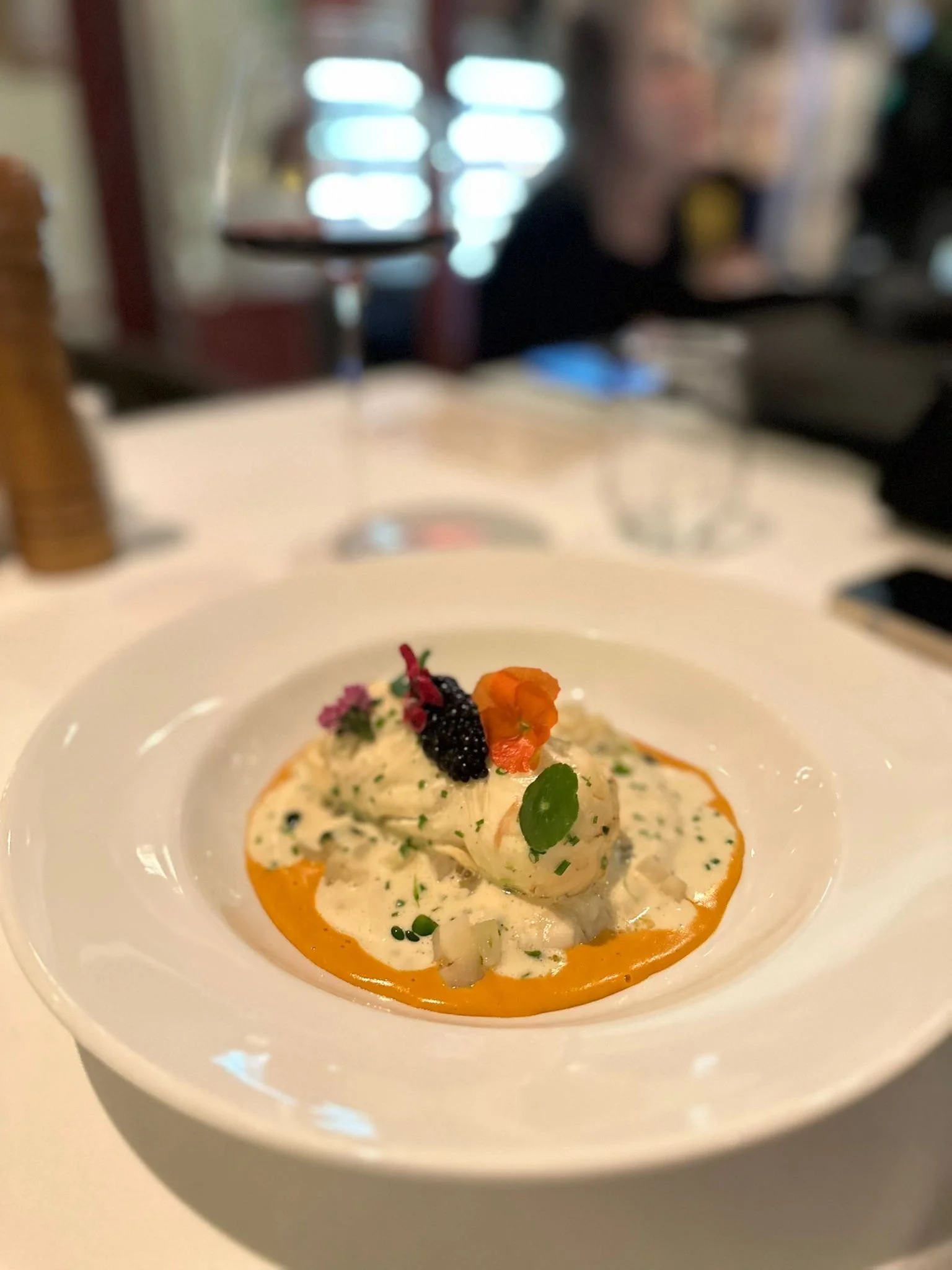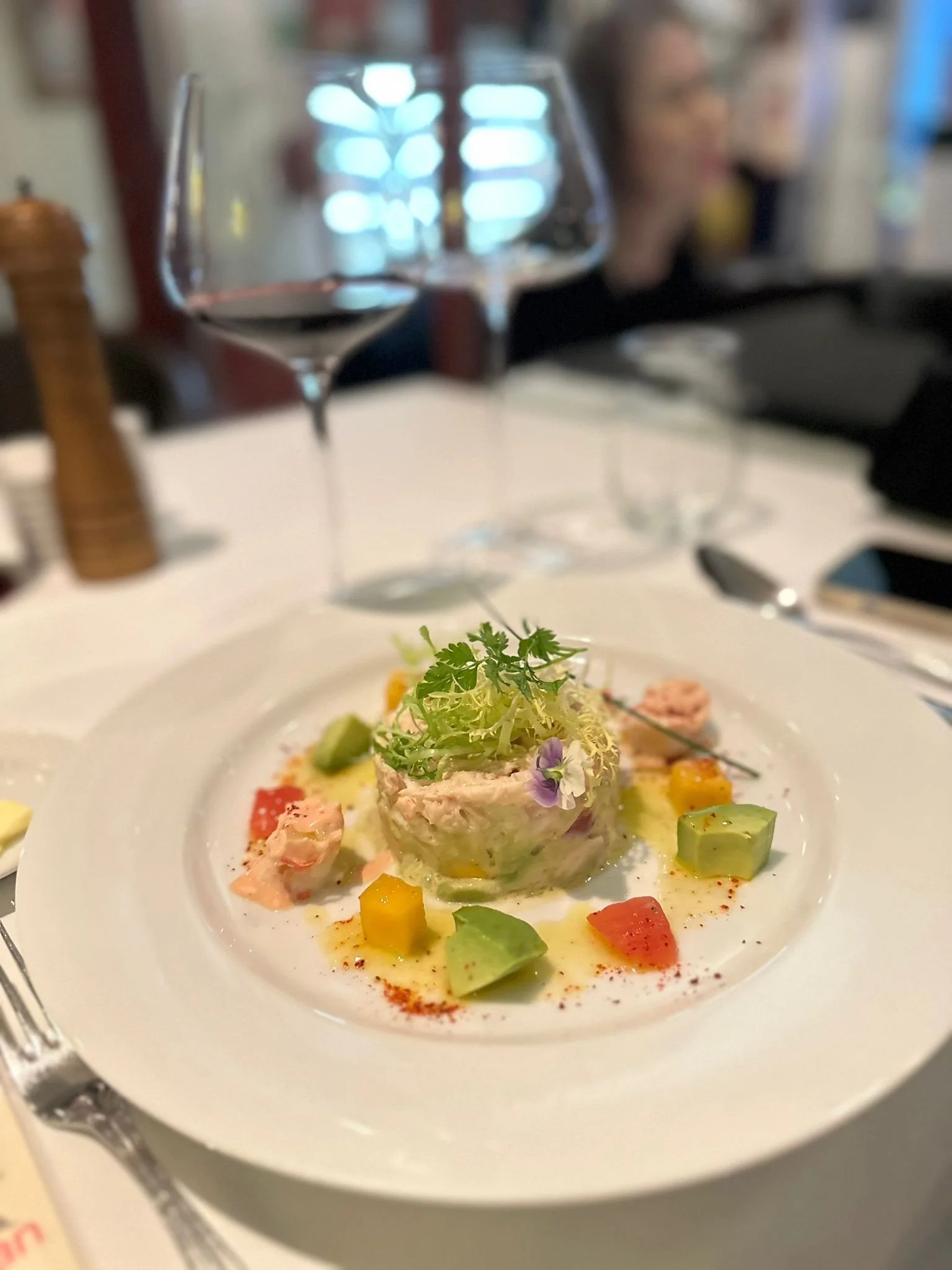 A fine dining plate with a seafood appetizer, garnished with microgreens, edible flowers, avocado, and diced vegetables, with two wine glasses in the background