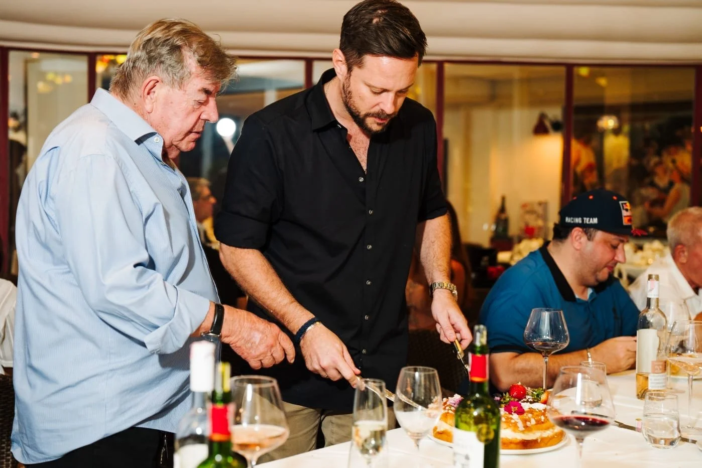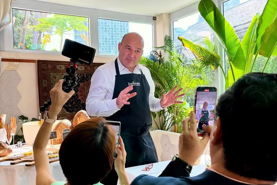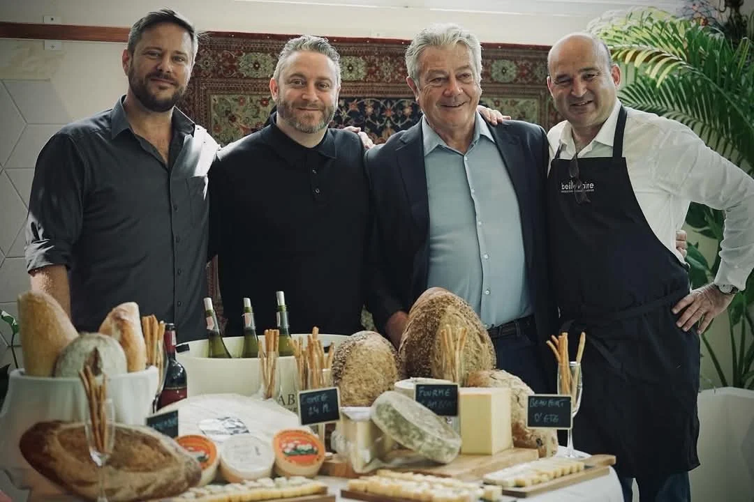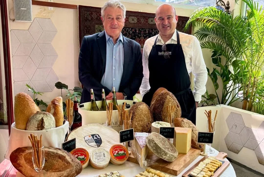 Two men standing behind a table with various cheeses, breads, breadsticks, and bottles of wine, in a room with plants and decorative wall panels.