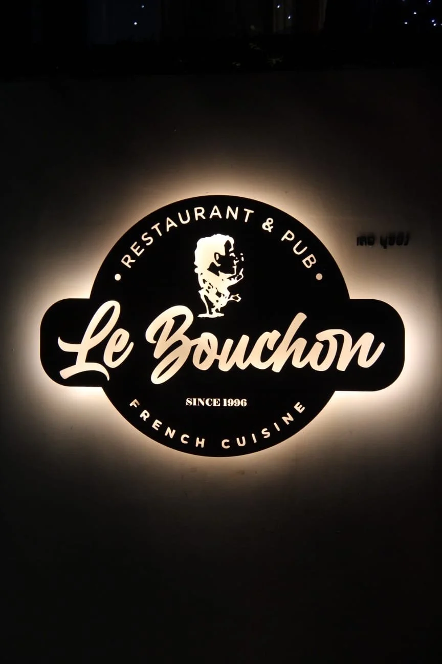 Exterior view of Le Bouchon restaurant and pub, with a beige wall, illuminated sign, pink gate, steps leading inside, and greenery with flowers.