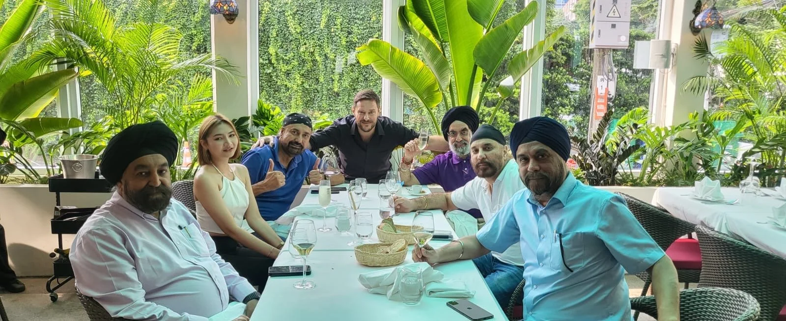 Four men standing together at a table with various breads and cheeses in front of them, indoors with a decorative wall hanging and green plants in the background.