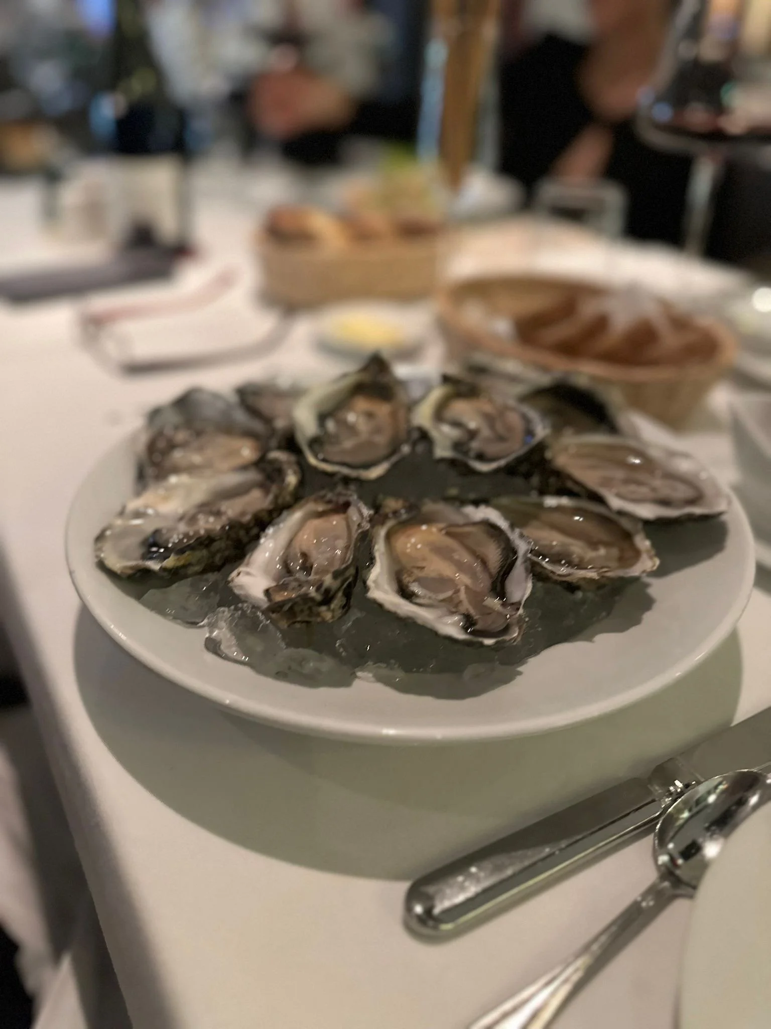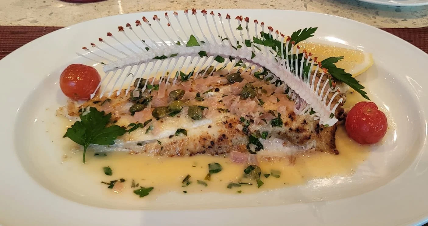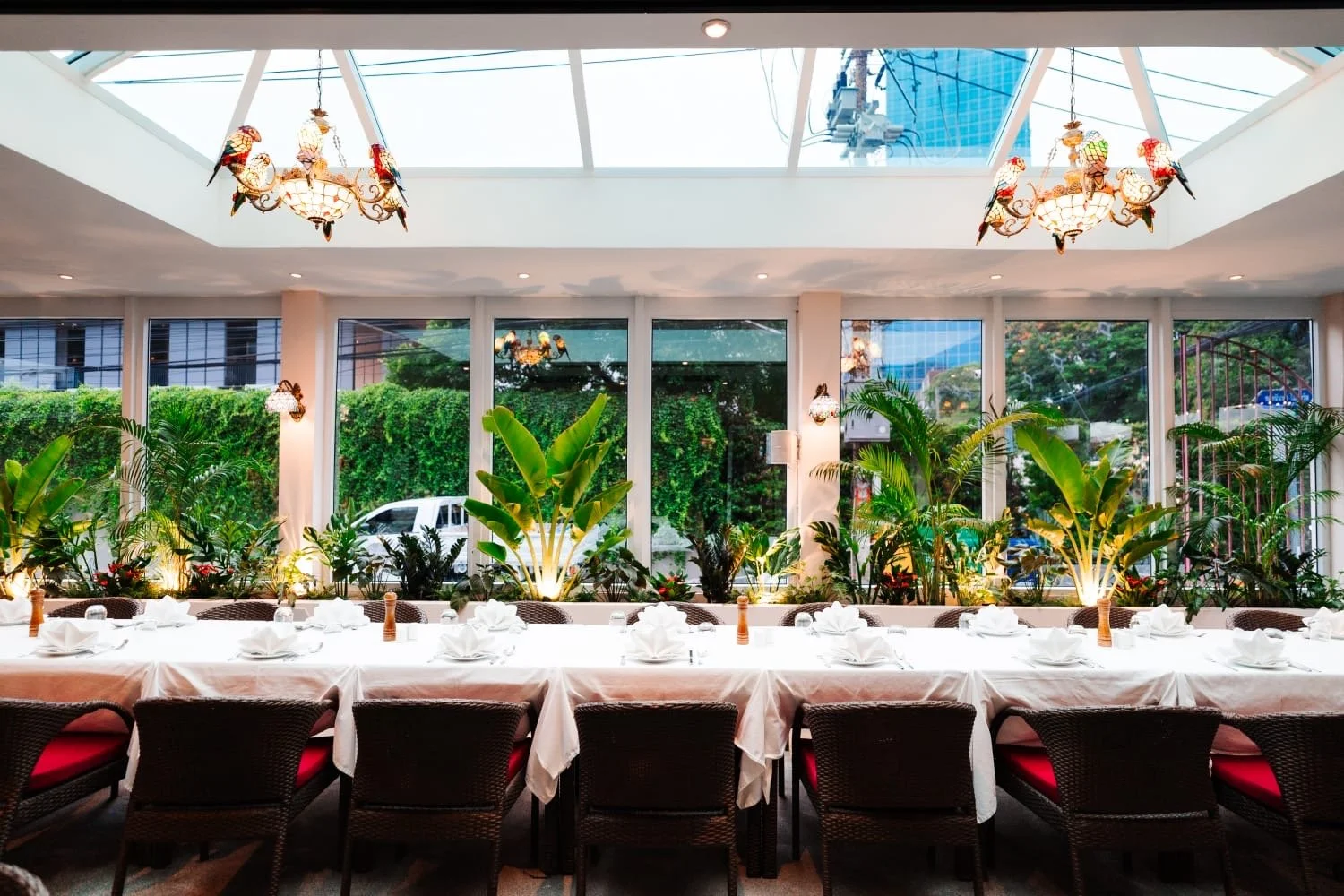 A warmly lit restaurant with tables set for dining, white tablecloths, napkins folded in a floral shape, wine glasses, water bottles, and small vases with yellow tulips. There are strings of hanging lights overhead, and an upper balcony with large gl
