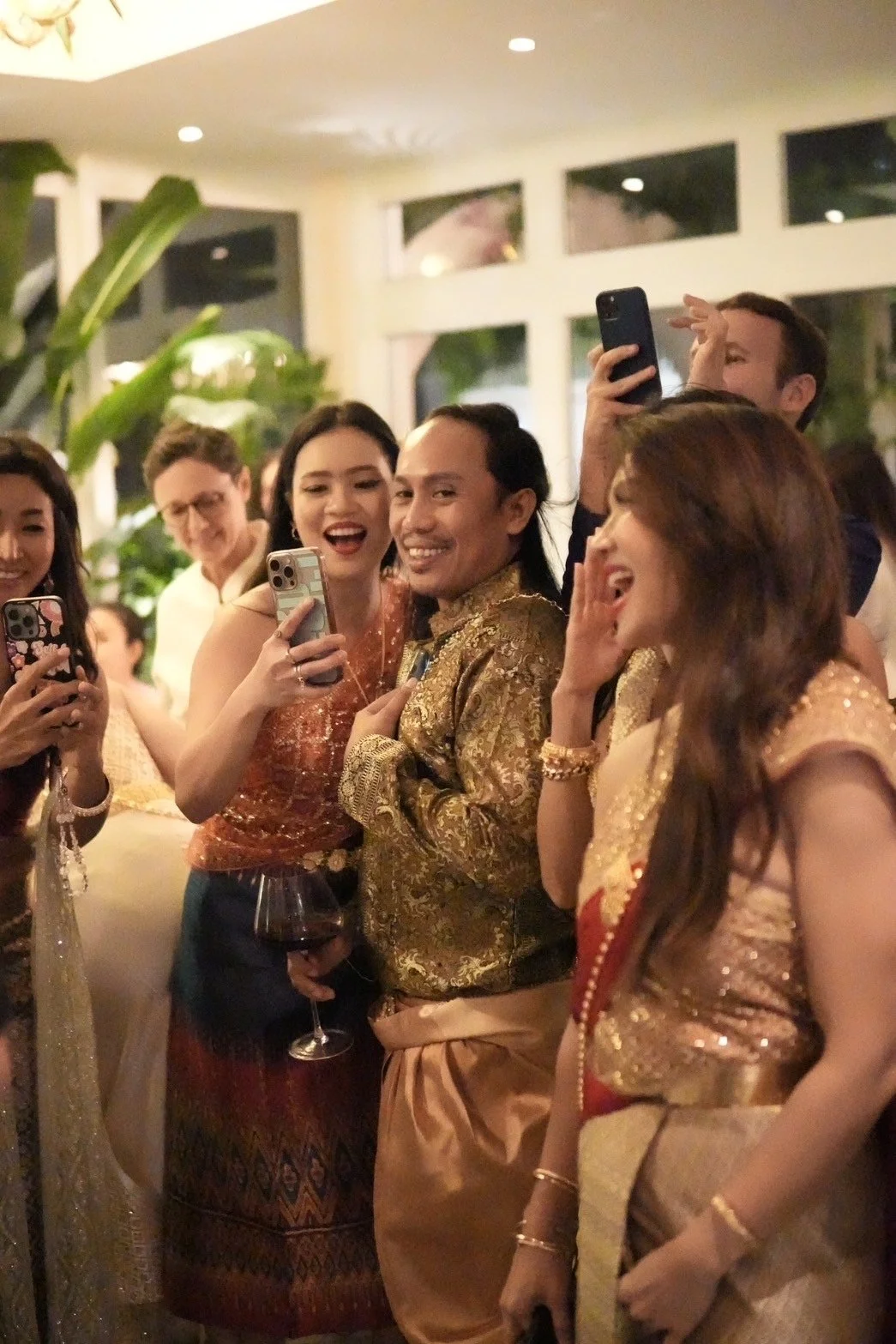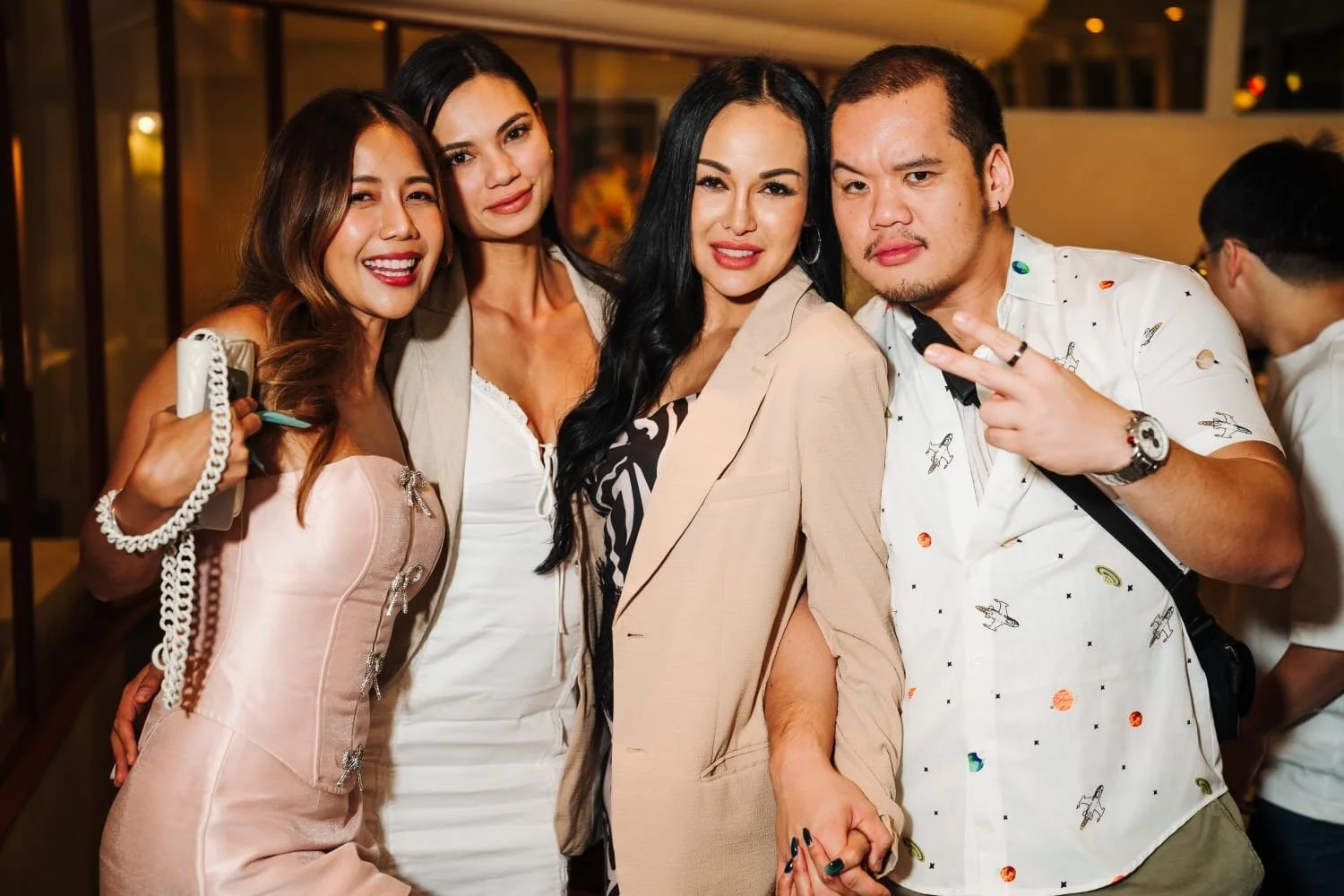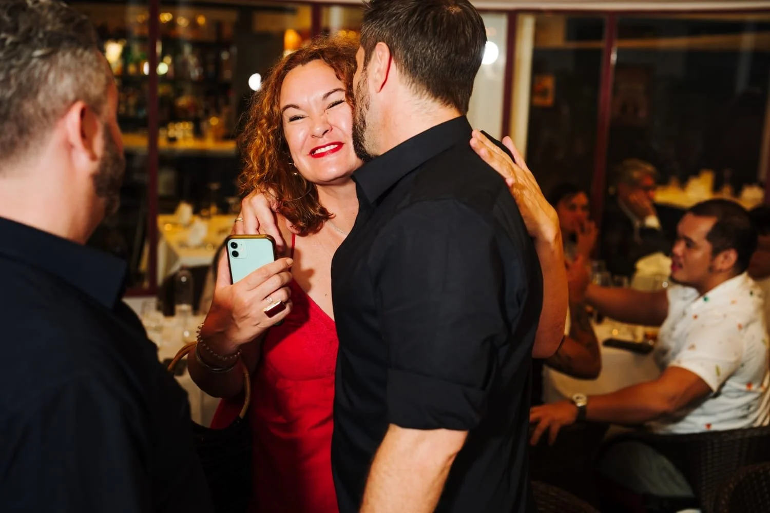 Group of four friends posing for a photo at a social gathering, with a woman holding a cell phone and smiling, and a man making a peace sign.