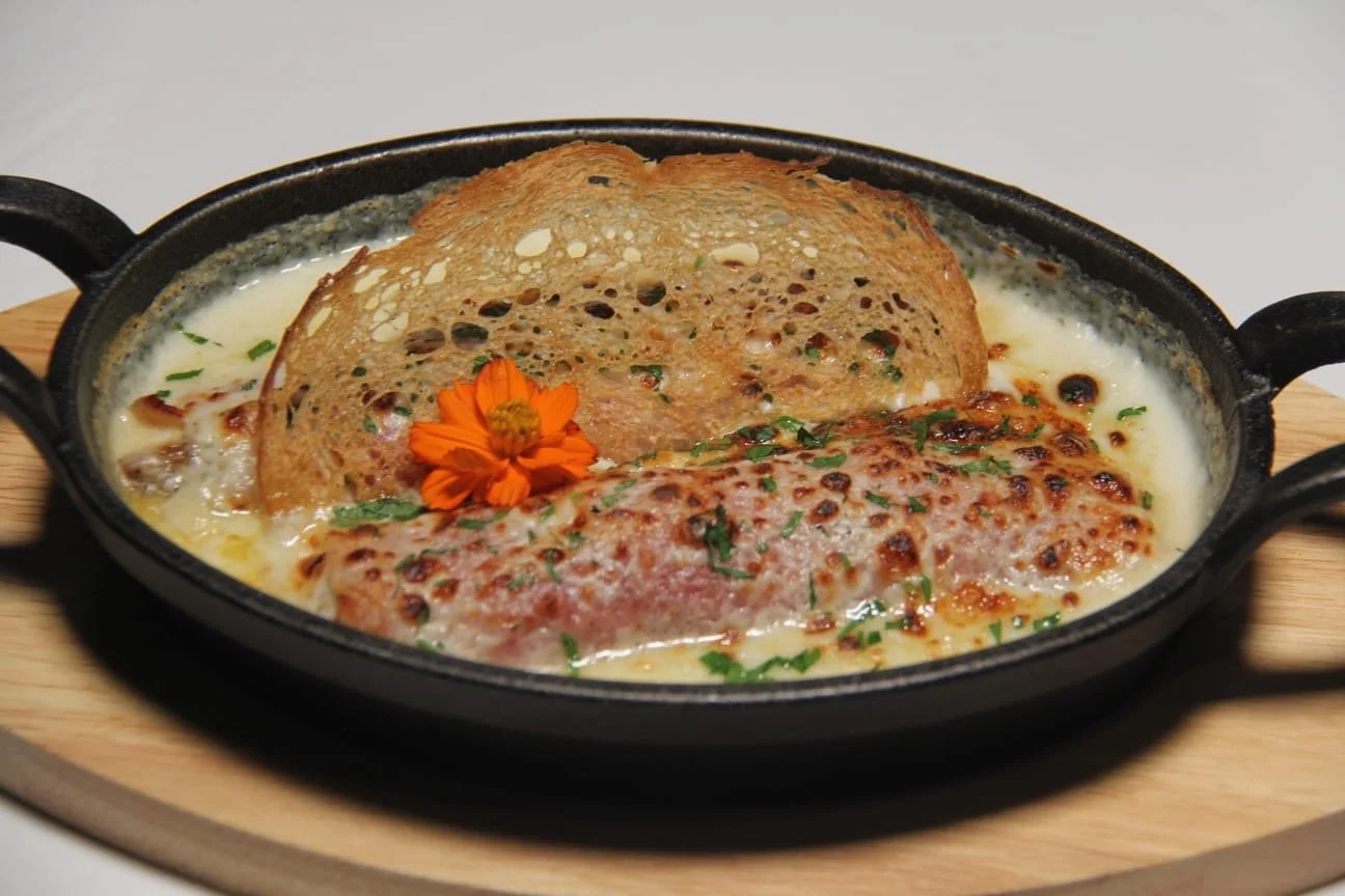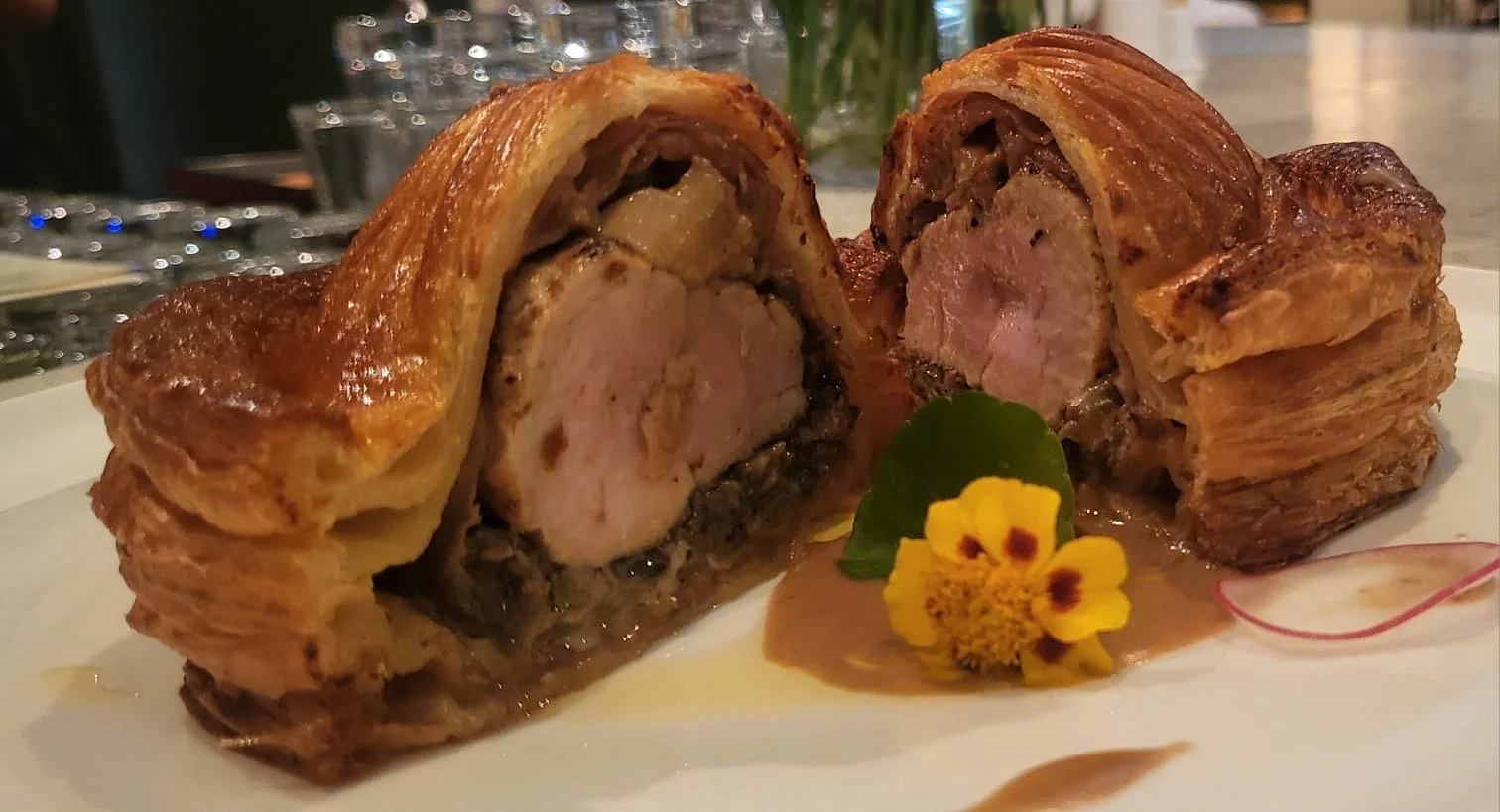 Close-up of a plated meat Wellington, sliced in half, with a flaky golden pastry crust, served with a side of sauce, garnished with a yellow edible flower and a green leaf.