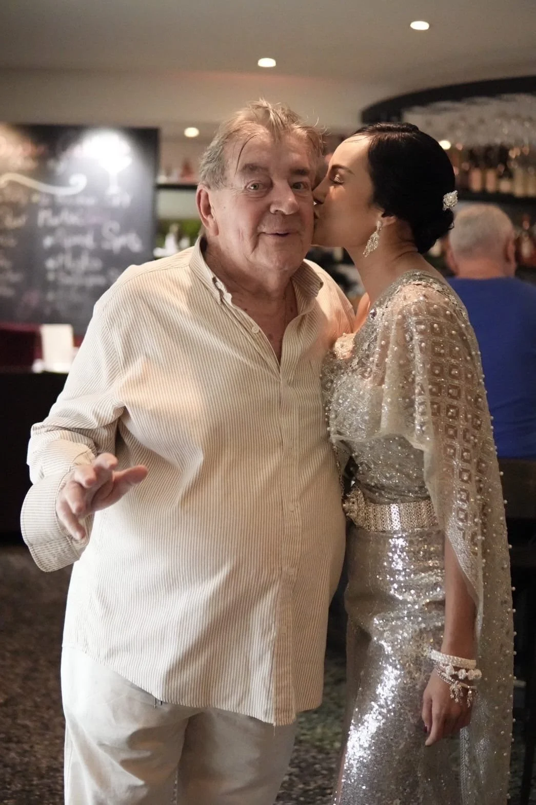 A woman in a shiny, beaded dress kisses a man in a striped shirt on the cheek at a social gathering or celebration.