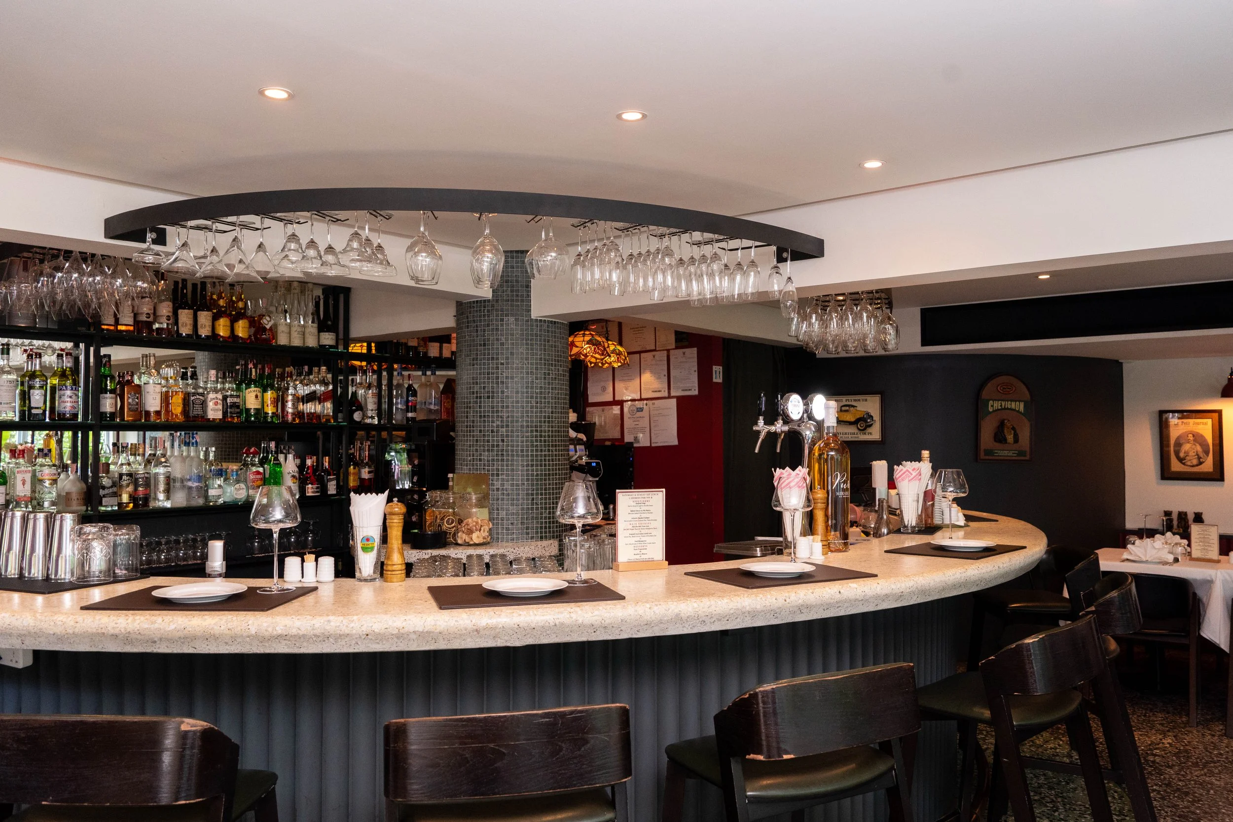 Interior of a restaurant bar with a curved countertop, hanging wine glasses, and shelves stocked with various bottles of alcohol.