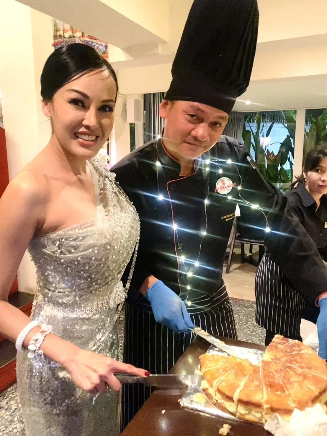 A woman in a sparkly, elegant dress and a chef in a uniform with a tall hat are slicing a large pie at a table in a restaurant or event setting.