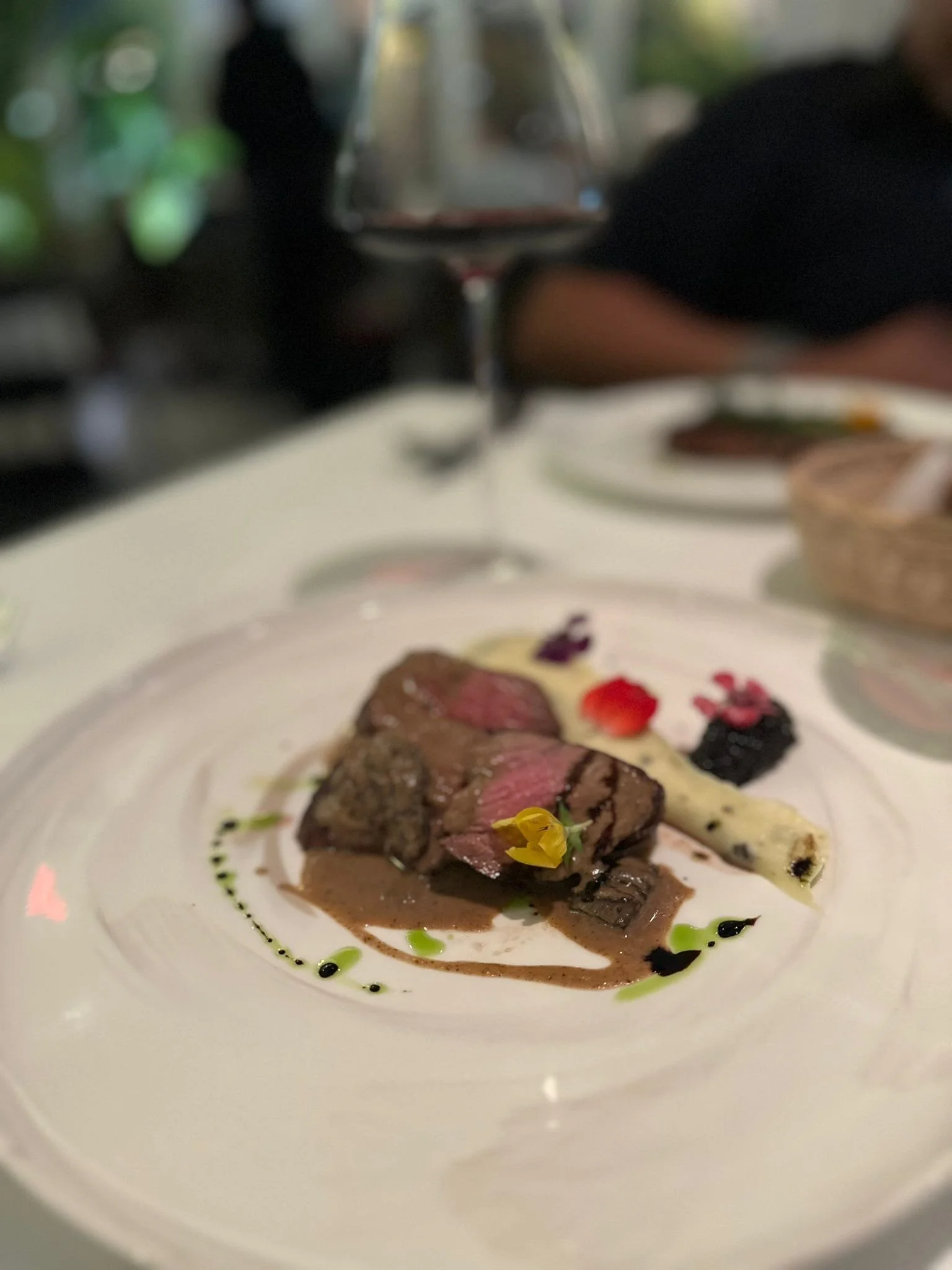 A plated gourmet steak dish with sauce, garnished with edible flowers, served with a side of mashed potatoes and berries.